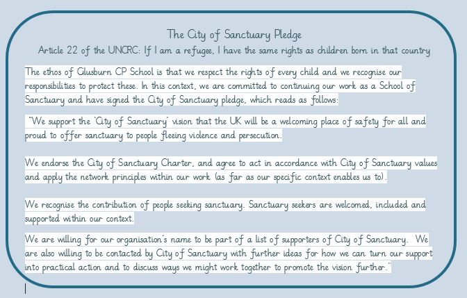We have signed the City of Sanctuary Pledge in recognition of our commitment to be a school of welcome for all.